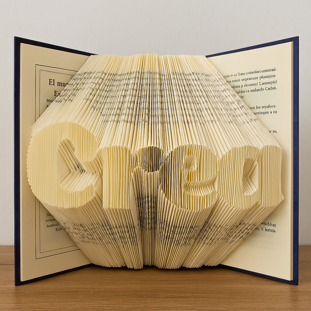 Con esta plantilla, podrás crear la figura de la palabra "Crea" utilizando la técnica del book folding, una forma de arte relajante, hermosa y profundamente significativa.